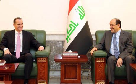 وقال المكتب الاعلامي لنائب رئيس الجمهورية في بيان ان نوري المالكي بحث مع المبعوث الخاص لرئيس الولايات المتحدة الاميركية بريت مكغورك بحضور السفير الاميركي بالعراق دوغلاس سيليمان مستجدات الوضع السياسي والامني في العراق والمنطقة وسبل تعزيز العلاقات الثنائية بين البلدين .