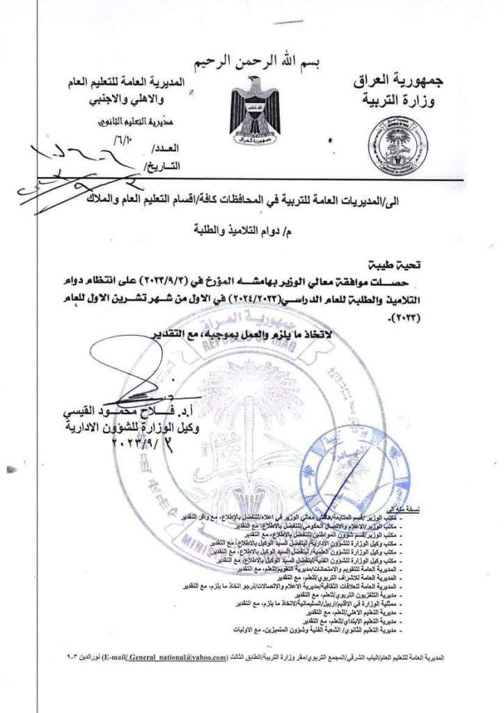 وزارة التربية تحدد اليوم الاول من شهر تشرين الاول موعداً لإنتظام دوام التلاميذ والطلبة في عموم العراق للعام الدراسي ٢٠٢٣-٢٠٢٤