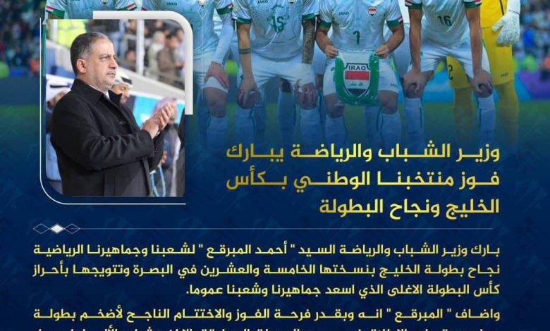 بارك وزير الشباب والرياضة السيد ” أحمد المبرقع ” لشعبنا وجماهيرنا الرياضية نجاح بطولة الخليج بنسختها الخامسة والعشرين في البصرة وتتويجها بأحراز كأس البطولة الاغلى الذي اسعد جماهيرنا وشعبنا عموما.