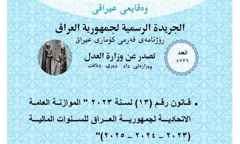 اعلنت وزارة العدل ، اليوم الاثنين عن نشر قانون الموازنة العامة الاتحادية في جريدة الوقائع العراقية بالعدد ( 4726)